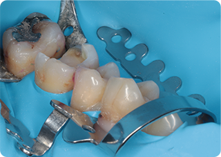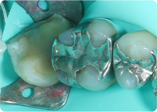 | ポイント | ラバーダム防湿下で接着することにより、歯とセラミックが一体化することを狙った。オーバーレイにすることで、歯ぐきに近い健康な歯質を削らずに治療することができる。 |