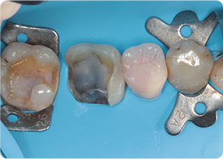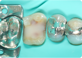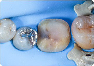 | ポイント | 銀歯の中はむし歯になっていた。金属イオンにより歯の内部に黒い部分があるが、むし歯を染め出すう蝕検知液を使用し、選択的にむし歯のみを除去。また、セラミック装着時にラバーダム防湿を行うことで、詰め物の接着効果を最大限発揮できるようにした。 |