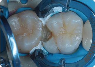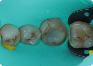 | ポイント | う蝕検知液を用い、選択的にむし歯の箇所のみ削り、最小限の切削を目指した。また充填時にラバーダム防湿を行うことで、レジンの接着効果が最大限発揮できるようにした。 |