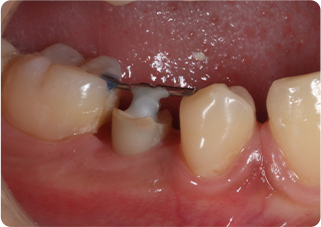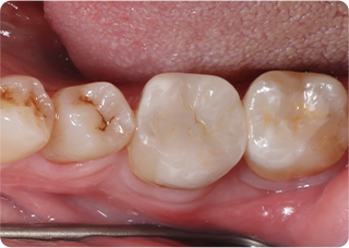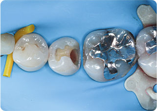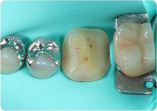 | ポイント | 銀歯の詰め物の中がむし歯になっていたため、う蝕検知液を使用し選択的にむし歯のみを除去。またセラミック装着時にラバーダム防湿を行うことで、詰め物の接着効果を最大限発揮できるようにした。 |