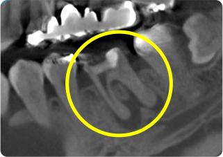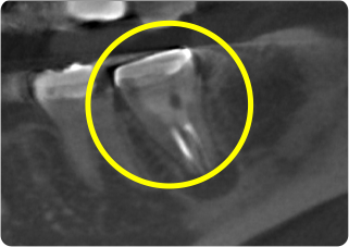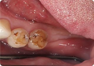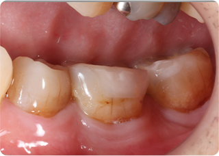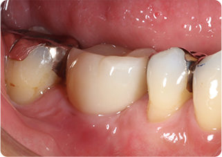 | ポイント | 銀歯の中でむし歯が進行し、保存不可能だったため抜歯し、後ろの親知らずを移植。移植の際に3Dプリンターで作製した親知らずのレプリカを使用し、治療時間の短縮と移植ポジションの確認を行った。生着するのを待ち、精密根管治療を行った後、セラミッククラウンを装着した。 |
