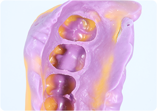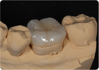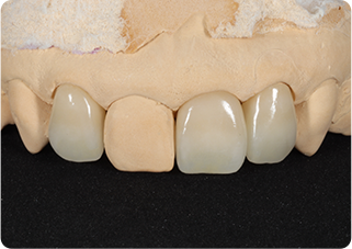 | ポイント | 仮歯で歯ぐきの状態を整え、自然な色、形となるようにオーダーメイドでセラミックを盛り、クラウンを作製した。 |