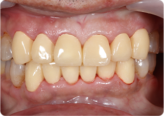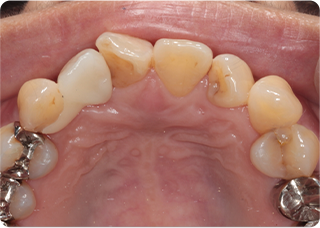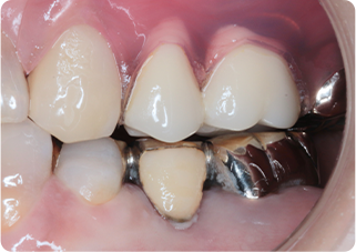 | ポイント | ブリッジの支台歯はセラミックに置き換え、ダミーの歯のところにインプラントを埋入した。セラミックはなるべく周りの歯と色を合わせて作製している。 |