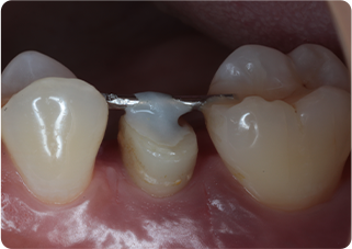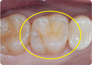| ポイント | むし歯ではないが、削らないと着色が取れなかったため、褐線の部位のみ削り、色が合うように詰め物の色を調整した。また充填時にラバーダム防湿を行うことで、詰め物の接着効果が最大限発揮できるようにした。 |