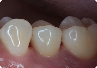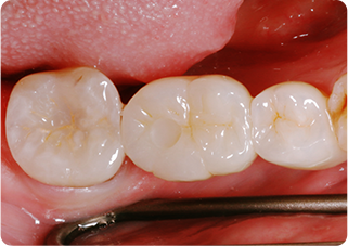 | ポイント | 歯科技工士により、奥歯であっても周囲の歯に自然に馴染む色合いで精密なセラミックを作製。またセラミック装着時にラバーダム防湿を行うことで、詰め物の接着効果を最大限発揮できるようにした。 |